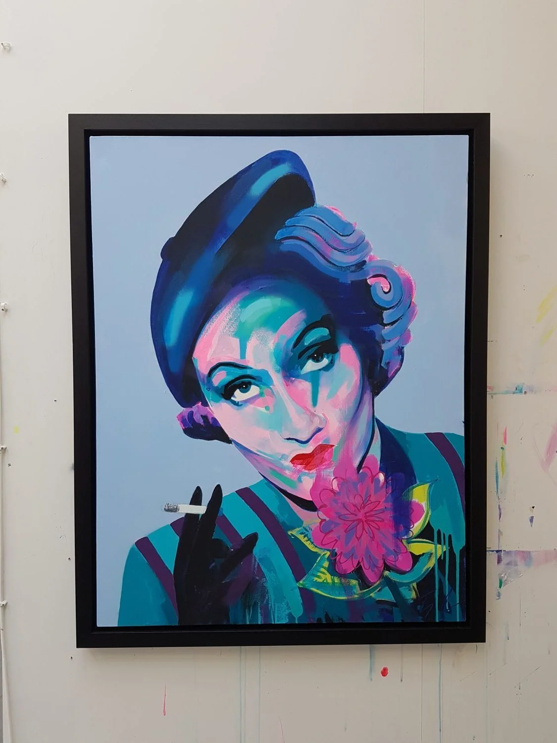 In recent years I decided I wanted to try painting something new i.e. not architecture based. I painted two self-portraits taken from photos of me with a facial injury. I was very pleased with the results and they made me realise I am not an ‘architectural painter’ but simply a ‘painter’. I then began to explore my style of painting without the context of buildings. I have then started a series of portraits based on photos of victorian people and people from the 1940’s. Since these paintings I have develpoed a strong interest in silver screen actors and other iconic figures from that era. I enjoy the contrast created between the old fashion style of the charecter and my modern and unique style of painting. Even though this is a totally different subject matter from my previous work, the bold juxtopositioning of colours and mediums keeps very much in the style of ‘Tim Fowler’.